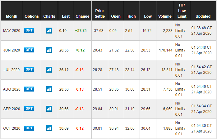 Gwałtowne niezrozumiałe na pierwszy rzut oka wahania w górę i w dół notowań ropy w ostatnich dniach w popularnych serwisach finansowych (np. tutaj) łatwo wyjaśnić tym, że dane te stanowią swoisty "zlepek" notowań kolejnych serii kontraktów terminowych (futures) na ten surowiec. A jak pokazuje obecna sytuacja ceny tych serii potrafią się dramatycznie różnić. Przykładowo cena serii z dostawą majową spadła niemal do zera (!), zaś cena z dostawą w październiku przekracza 30 USD za baryłkę.