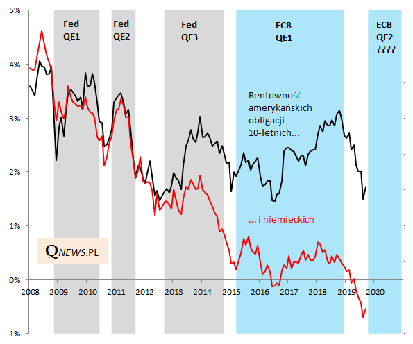 Zacznijmy od obligacji. Wydawać by się mogło, że QE, czyli skup obligacji musi prowadzić nieuchronnie do wzrostu ich cen, czyli spadku przyszłej rentowności. Rzeczywistość wyglądała jednak inaczej. Największe spadki rentowności zaobserwowaliśmy ... przed rozpoczęciem QE oraz w końcowych fazach QE. Co ciekawe obecna sytuacja dobrze wpisuje się w ten schemat - rentowności zaczęły powoli spadać pod koniec europejskiego QE (II połowa 2018), a po jego zakończeniu doszło wręcz do załamania. Czyżby po ewentualnym ogłoszeniu powrotu do QE trend miał się zacząć odwracać?