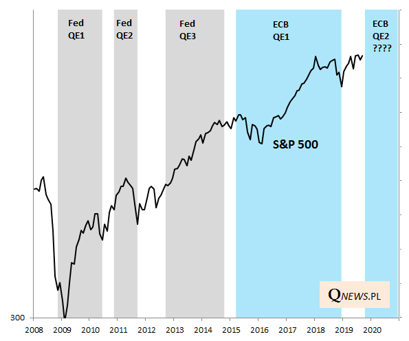 Oprócz tego ECB ogłosił od listopada powrót do QE (quantitative easing, luzowanie ilościowe), czyli masowego skupu obligacji skarbowych i korporacyjnych. Ma wynieść 20 mld euro miesięcznie, bezterminowo.