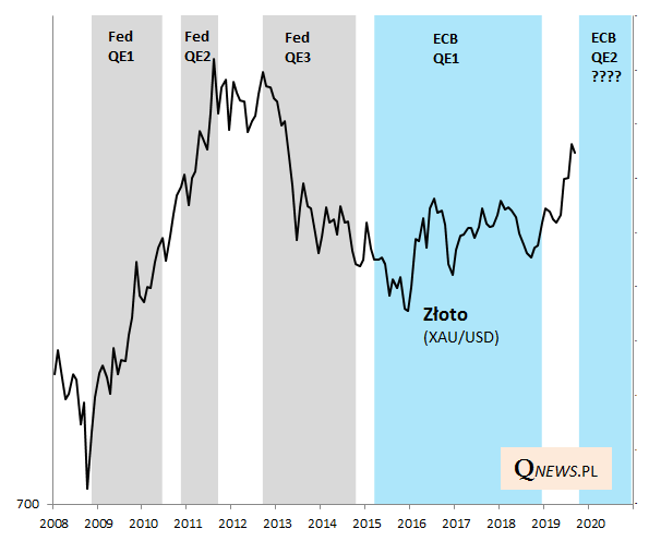Jednoznacznego wpływu najtrudniej dopatrzyć się natomiast w przypadku złota, które w trakcie niektórych rund QE potrafiło gwałtownie drożeć (QE1, QE2), innym razem gwałtownie taniało (QE3), zaś w trakcie ECB QE było w trendzie bocznym.