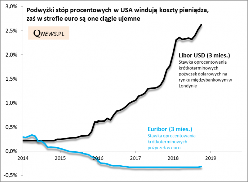 Nie jest tajemnicą, że krótkoterminowe koszty pieniądza w USA na skutek podwyżek stóp procentowych przez Fed idą w górę. W tym samym czasie koszty pieniądza w strefie euro właściwie stoją w miejscu na skrajnie niskim poziomie, bo Europejski Bank Centralny nie spieszy się z podwyżkami (pierwsza ma być w połowie 2019).
