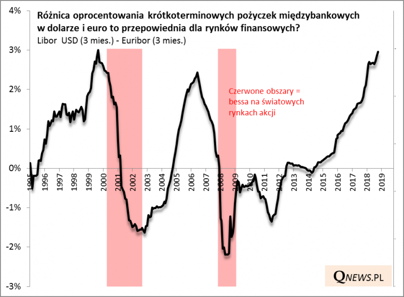 Jest też jednak dobra wiadomość. Zauważmy, że globalne bessy startowały nie w okresach dochodzenia spreadu do szczytów, lecz dopiero wtedy, gdy spread zaczynał się szybko kurczyć - na skutek tego, że koszty pieniądza w Europie zaczynały gwałtownie "gonić" za wyższymi kosztami w dolarze (czyżby polityka EBC i jego poprzedników była z natury mocno opóźniona względem Fedu?).