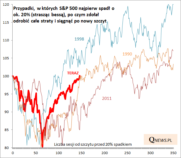 Jak widać odreagowanie na Wall Street przebiega gdzieś pomiędzy poszczególnymi wariantami (czyli pomiędzy euforycznym odbiciem z lat 1998-1999 i dość powolnym z lat 2011-12).