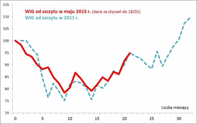 Pomijając chwilowe odchylenia, ścieżka, po jakiej podąża WIG od wiosny 2015 r. do złudzenia przypomina to, z czym już wcześniej mieliśmy do czynienia. Po niemal dokładnie tak samo głębokiej przecenie jak w II poł. 2011 r. indeks przez pewien czas pozostawał w strefie wahań w ramach trendu bocznego, po czym wybił się z niego górą. Gdyby brać tę ciągle utrzymującą się analogię jako wyznacznik, to można by przyjąć, że w ramach naszego giełdowego déjà vu jesteśmy znów gdzieś w grudniu 2012 r. Teraz według tego „modelu” powinna czekać inwestorów głębsza korekta (potrzebny byłby tylko jakiś pretekst).