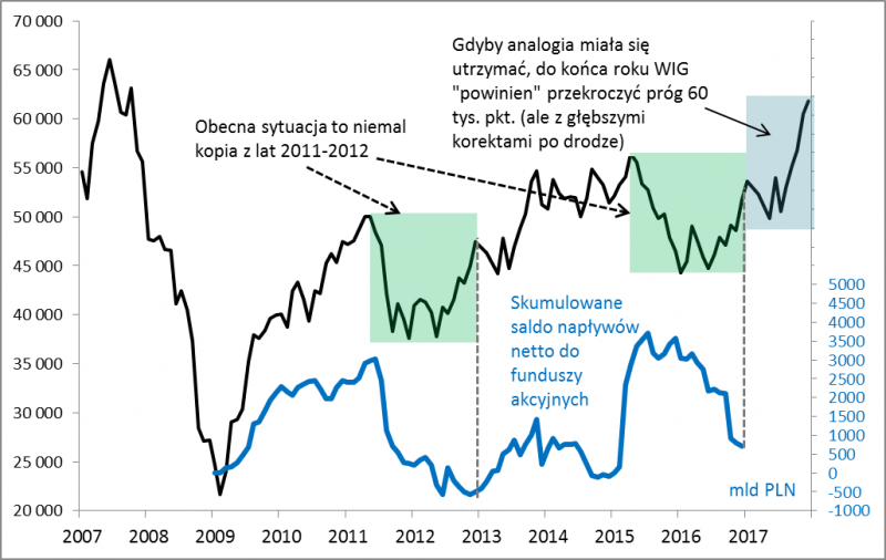 Sama analiza nastrojów nie pozwala więc jeszcze odpowiedzieć na pytanie czy taka potencjalna korekta miałaby być tylko przystankiem na drodze ku wyższym poziomom notowań. Musimy więc odwołać się do innych narzędzi. Z pomocą przychodzi prosta analogia. Już wiele miesięcy temu zauważyliśmy podobieństwo obecnej sytuacji na GPW do tej z lat 2011-2013.