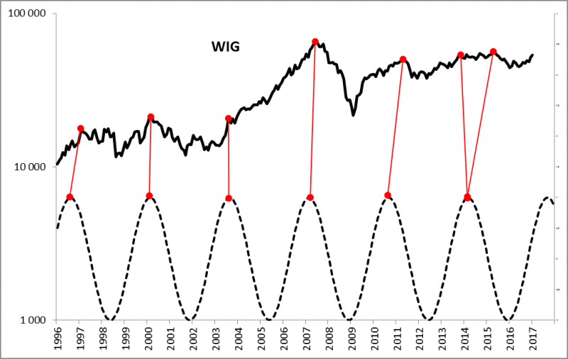 Cała ta koncepcja nieźle wpisuje się też w prezentowany już wielokrotnie model cyklu koniunkturalnego, w myśl którego z cyklicznym dołkiem na GPW mieliśmy do czynienia na przełomie lat 2016/2017, zaś odpowiedni szczyt „sinusoidy” można orientacyjnie wyznaczyć na wrzesień br. (plus/minus kilka miesięcy; raczej plus).
