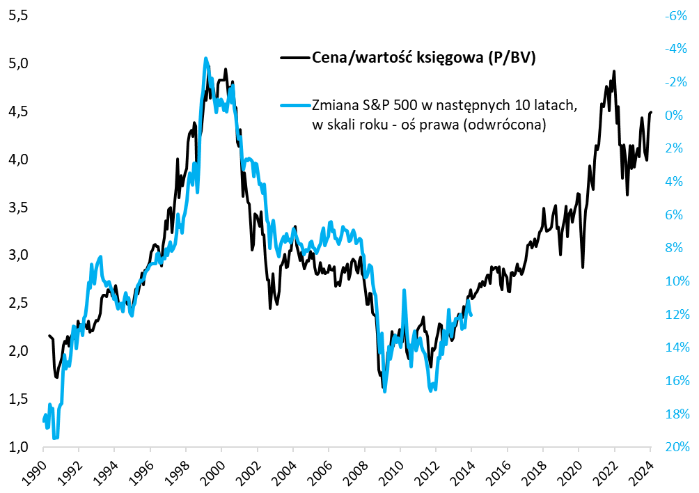 Jak pokazujemy na kolejnym wykresie, tzw. forward P/E był dość trafnym prognostykiem dla przyszłych, 10-letnich zmian S&P 500. Zasada jest prosta – im niżej P/E, tym lepsze perspektywy na dłuższą metę. Dosłowne nałożenie przyszłej, 10-letniej zmiany indeksu na wykres P/E daje obecnie raczej niezbyt imponujące perspektywy – przyszłe zmiany S&P 500 można w ten sposób szacować (bardzo orientacyjnie) na ledwie dodatnim poziomie. Dla porównania, w dołku jesiennej korekty spadkowej, przy P/E w okolicy 17, szacowana przyszła zmiana indeksu wynosiła prawie +5 proc. w skali roku. A w dołku bessy na jesieni 2022 ten szacunek był na poziomie 7 proc. w skali roku.