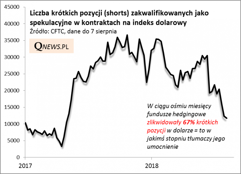 O źródłach umocnienia dolara powiedziano już wiele (trwające podwyżki stóp procentowych w USA oraz "normalizacja" bilansu Fedu, status USD jako bezpiecznej przystani). Trafiliśmy jednak na kolejny, czysto rynkowy trop w tej sprawie. Z obserwacji danych komisji CFTC wynika, że aprecjacja USD, to w jakimś stopniu także efekt tzw. short squeeze, czyli pospiesznego zamykania krótkich pozycji w dolarze (czyli zakładów na spadek wartości tej waluty) przez dużych spekulantów (fundusze hedgingowe).
