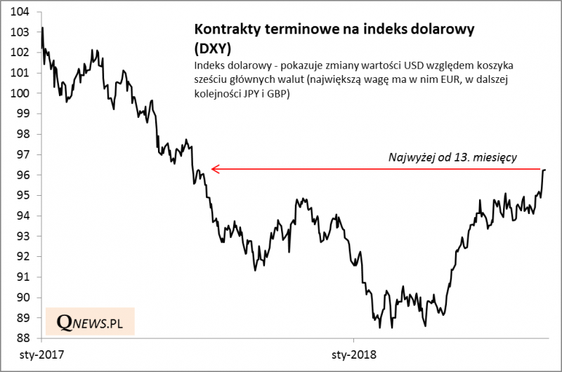 Umacniający się względem innych walut dolar pozostaje "kulą u nogi" dla tych aktywów, które tradycyjnie są z nim ujemnie skorelowane, czyli przede wszystkim dla złota oraz akcji na rynkach wschodzących. Zawirowania polityczne w Turcji przyczyniły się do przebicia przez tzw. indeks dolarowy (U.S. Dollar Index - pokazuje notowania USD względem kilku najważniejszych walut) ważnej technicznej bariery. Amerykańska waluta jest najmocniejsza od ponad roku.