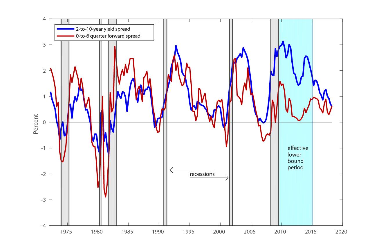 Badacze pokazali nawet, że w ostatnim czasie tak skonstruowana krzywa wcale się nie spłaszczała, a nawet wręcz przeciwnie (czerwona linia pokazuje różnicę między oczekiwaną stopą Fedu za 6 mies. a obecnym jej poziomem).