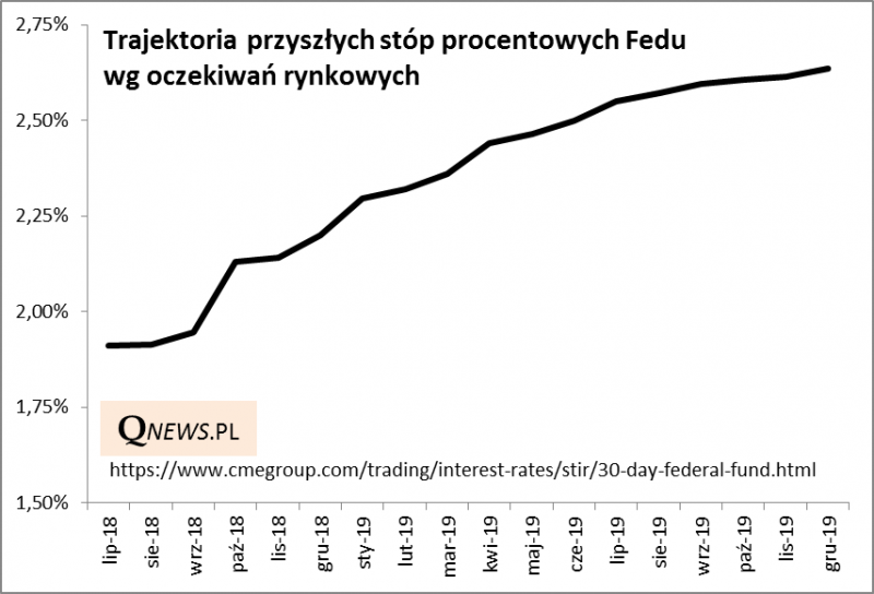 Sygnałem alarmowym byłaby więc sytuacja, w której rynek oczekuje, że przez półtora roku stopy spadną. I tutaj dobra wiadomość - obecnie nie mamy do czynienia z taką sytuacją. Trajektoria oczekiwanych stóp Fedu jest jednoznacznie wznosząca.