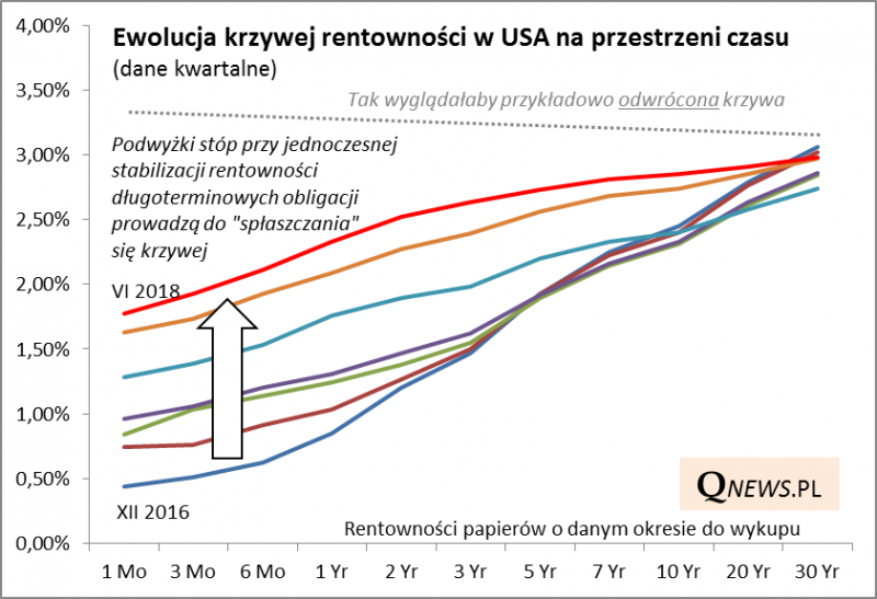 Opisywany przez nas wielokrotnie temat krzywej rentowności obligacji (yield curve) w USA jako dobrego prognostyka recesji/globalnej bessy ostatnio jest bardzo intensywnie komentowany (np. na Twitterze). Krzywa na przestrzeni ostatnich kilkunastu miesięcy ulega dość systematycznemu "spłaszczaniu".