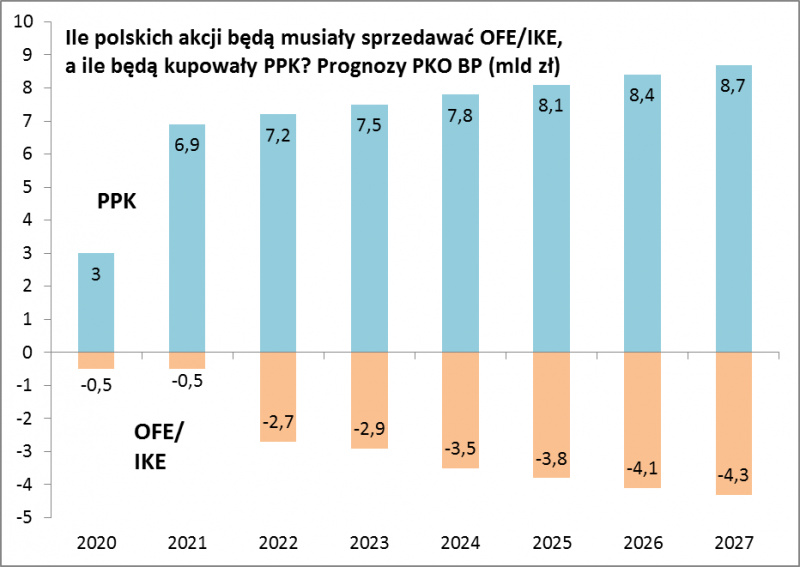 Rys. 2. Kontrolowany przez rząd PKO BP przekonuje, że nieunikniona podaż akcji ze strony OFE/IKE będzie z nawiązką rekompensowana przez zakupy ze strony PPK. Ale czy PPK zdobędą zaufanie społeczne w obliczu ciągłego majstrowania przy systemie emerytalnym? Poza tym te kalkulacje nie obejmują w ogóle tematu akcji przejętych potencjalnie przez FRD…
