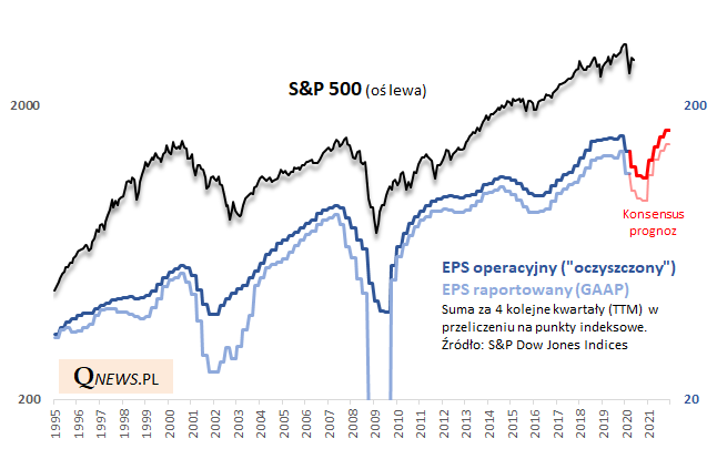 Może zatem bazować na EPS prognozowanym na przyszły rok? Właśnie takie jest częste podejście analityków. Przy obecnej prognozie (164 USD) i aktualnym poziomie S&P 500 dawałoby to P/E’21 rzędu 17,4. Czyli ani szczególnie dużo, ani też nisko. Innymi słowy, bazując na prognozach na 2021 amerykański indeks nie wydaje się ani bardzo drogi, ani też tani.