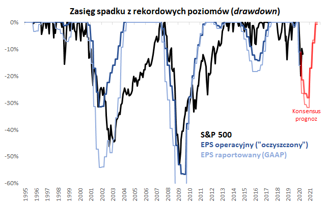 Pojawia się jednak inny problem - z naszej obserwacji wynika, że po poprzednich dwóch recesjach do rekordowych poziomów powracały najpierw nie ceny akcji, lecz EPS (co może wydawać się nieintuicyjne). Przez pryzmat tej reguły można się zastanawiać czy tym razem S&P 500 nie zagalopował się za bardzo względem zysków, które nawet wg prognoz mają spadać przez cały ten rok.