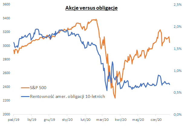 Mimo trwającego trzy miesiące odreagowania na giełdach, rentowności obligacji skarbowych pozostają w zasadzie na niskich, "koronawirusowych" poziomach. Przykładowo rentowność amerykańskich papierów 10-letnich od marca dryfuje blisko rekordowo niskich pułapów.