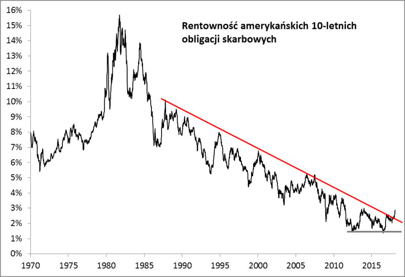Większy był tylko bezpośrednio po globalnym kryzysie finansowym 2008/2009 (a przecież teraz żadnego kryzysu nie ma; strach myśleć co by z deficytem stało się w razie recesji). A ogromny deficyt to większa podaż obligacji. Z drugiej strony rynku nabywcą obligacji przestała być Rezerwa Federalna, która od jesieni odchudziła swój portfel papierów skarbowych o prawie 30 mld USD. Ostatnio coraz mniej chętnie kupują nawet Chiny. Nic dziwnego, że rentowności obligacji za oceanem rosną i kto wie czy nie osiągną jeszcze dużo wyższych poziomów, które musiałyby wywrzeć dalszą presję na wyceny akcji w USA.