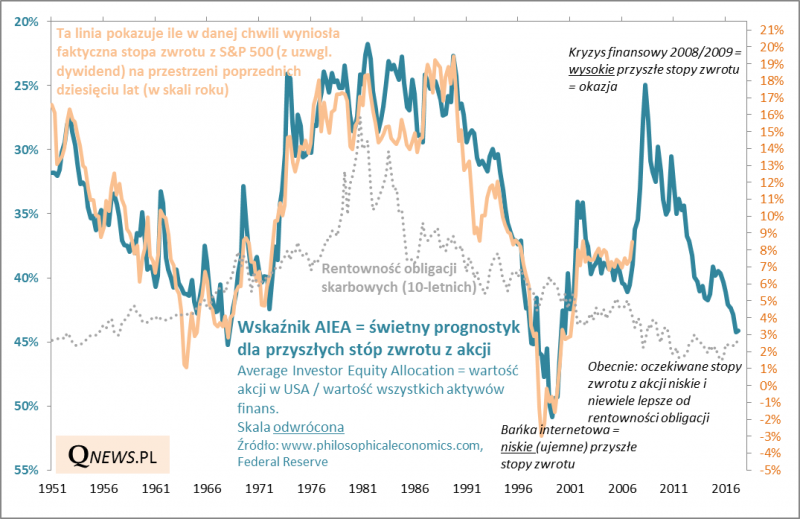 Tuż przed tąpnięciem na globalnych rynkach ostrzegaliśmy w naszej analizie, że "amerykańskie akcje stały się mniej rentowne niż obligacje". Na początku lutego szacowaliśmy na podstawie modelu AIEA (Average Investor Equity Allocation), że na skutek euforycznej zwyżki notowań przyszłe stopy zwrotu z akcji za oceanem skurczyły się do nieco ponad 2 proc. w skali roku w horyzoncie 10-letnim (właśnie w takim horyzoncie model AIEA świetnie się sprawdzał w przeszłości). A tymczasem rentowności obligacji 10-letnich w USA zaczęły się zbliżać do 3 proc.