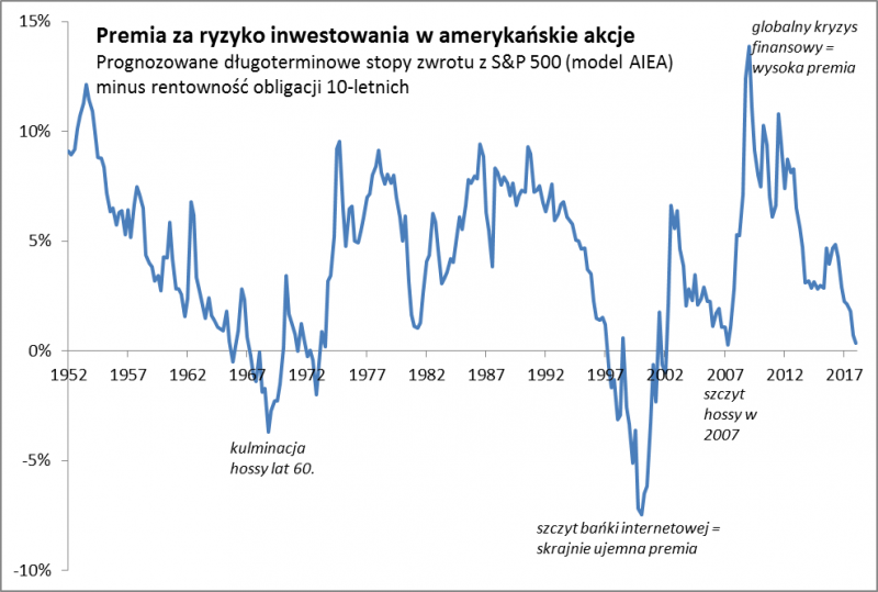 Nawet mimo faktu, że S&P 500 odrobił tylko część strat z ostatniej korekty, to premia za ryzyko inwestowania w amerykańskie akcje względem bardziej bezpiecznych obligacji ciągle jest bliska zeru.