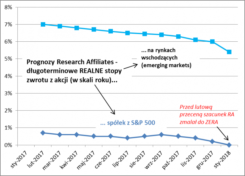 We wspomnianej analizie z początku lutego dodaliśmy, że nasze projekcje są zbieżne z bazującymi na zupełnie innej metodologii szacunkami firmy Research Affiliates. W ostatnich dniach okazało się, że aktualizacja szacunków RA na koniec stycznia pokazała długoterminowe stopy zwrotu z amerykańskich akcji na poziomie ... zero procent (uwaga - w ujęciu realnym, czyli po odjęciu inflacji). Pocieszające jest to, że ciągle w miarę przyzwoicie wyglądają projekcje dla akcji na rynkach wschodzących - na koniec stycznia RA szacowała stopy zwrotu na 5,4 proc. w skali roku (REALNIE), a po ostatniej przecenie ta prognoza zapewne pójdzie w górę.