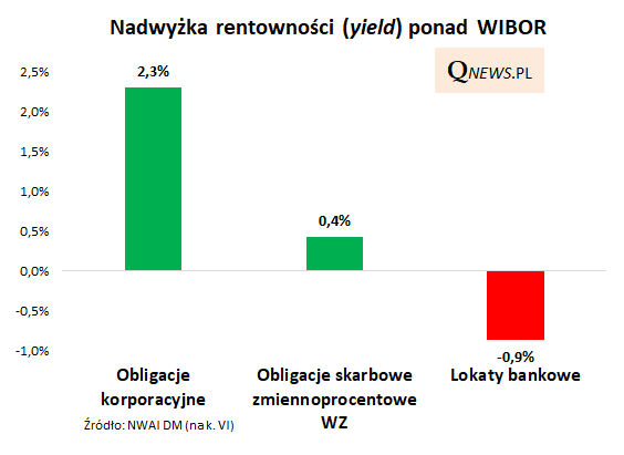 Dobra wiadomość natomiast jest taka, że mimo tego spadku, obligacje korporacyjne i tak nadal oferują konkurencyjną dochodowość. Średnia rentowność (yield, czyli wskaźnik uwzględniający zarówno poziom oprocentowania, jak i poziom notowań papierów na rynku wtórnym) była w czerwcu o 2,3 pkt. proc. wyższa od WIBOR - wynika z danych DM NWAI.
