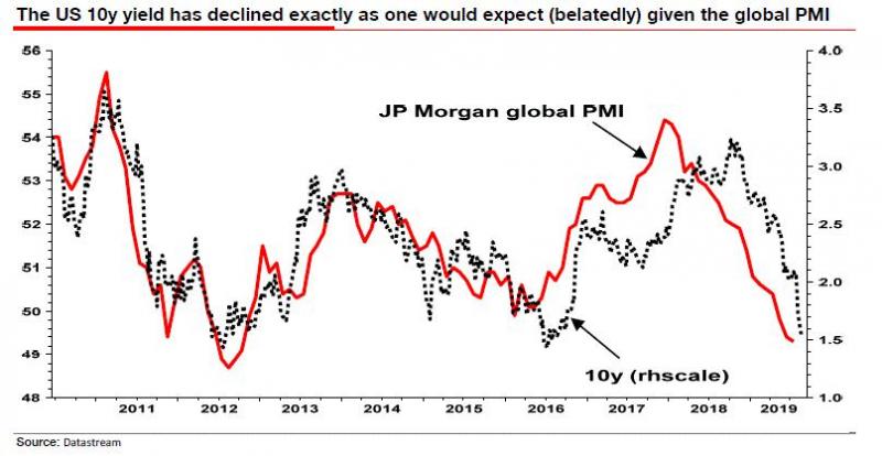 Edwards zakłada, że koniunktura będzie się nadal pogarszała w kierunku recesji, co wg powyższej korelacji powinno spychać rentowności na coraz niższe, bezprecedensowe poziomy (mówi nawet o docelowo ujemnych rentownościach w USA). Choć oczywiście, jak zawsze w inwestowaniu, nic nie jest ostatecznie przesądzone. Zauważmy, że w 2012 roku wskaźnik Global PMI też spadał do wieloletnich minimów, ale w którymś momencie ten trend się odwrócił. Podobnie jak trend na rynku długu.