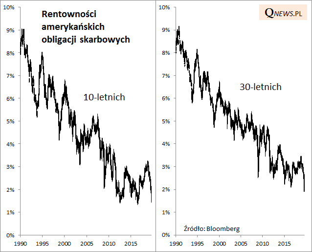 Pisaliśmy już o tym, że w tym roku świetną formą wykazują się aktywa defensywne, takie jak obligacje skarbowe i złoto. Trend ten cały czas jest kontynuowany. Rentowność amerykańskich obligacji 30-letnich po raz pierwszy w historii (!) zeszła poniżej progu 2%, zaś 10-letnich przymierza się do testowania dołków z lat 2012 i 2016.