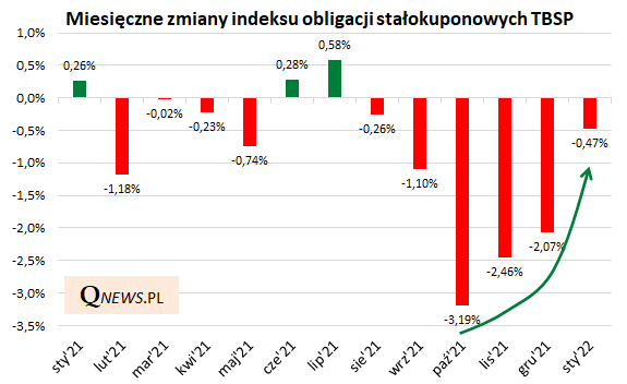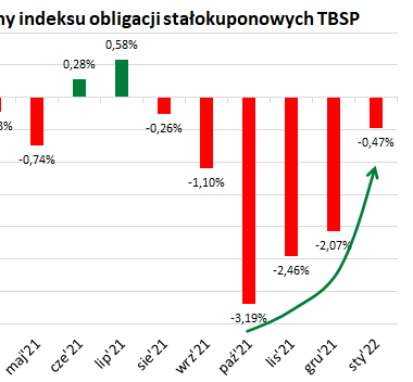 Styczeń okazał się już szóstym kolejnym miesiącem "pod kreską" dla krajowych obligacji skarbowych stałokuponowych (stanowiących "trzon" całego rynku obligacji hurtowych). W tym czasie gromadzący te papiery indeks TBSP stracił łącznie ponad 9% (do tego dochodzą jeszcze mniej regularne straty w I poł. 2021). Ale jest też dobra wiadomość - poniższy wykres pokazuje, że skala miesięcznych strat sytematycznie maleje. Najbardziej dramatyczny okazał się październik ub.r., gdy TBSP stracił ponad 3% na skutek szokującej dla rynku gwałtownej zmiany retoryki Rady Polityki Pieniężnej. Tymczasem w styczniu br. indeks spadł już "tylko" o niecałe 0,5%.