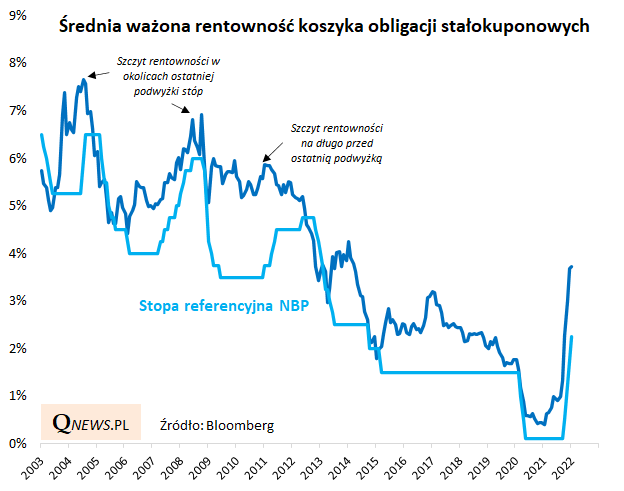 Inną dobrą wiadomością jest to, że średnia ważona rentowność omawianych obligacji (3,7%) jest najwyższa od prawie ośmiu lat i ma już spory zapas (ok. 1,5 pkt. proc.) względem poziomu stopy referencyjnej NBP.