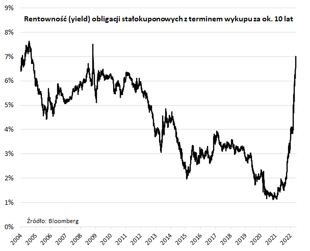 Wg danych Bloomberga tak wysokiej rentowności benchmarkowych obligacji 10-letnich nie notowano od 2008 roku, kiedy to dosłownie tylko na chwilę osiągnęła ten pułap wraz z zawirowaniami rynkowymi po upadku Lehman Brothers. Wcześniej rentowności powyżej 7% pojawiły się na przestrzeni 2004 roku.