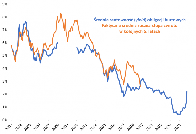 Tymczasem na drugim wykresie pokazujemy, że historycznie wyjściowy poziom rentowności był całkiem niezłym prognostykiem, jeśli chodzi o przyszłe całkowite stopy zwrotu z koszyka obligacji, np. w zaprezentowanym tu horyzoncie 5-letnim.