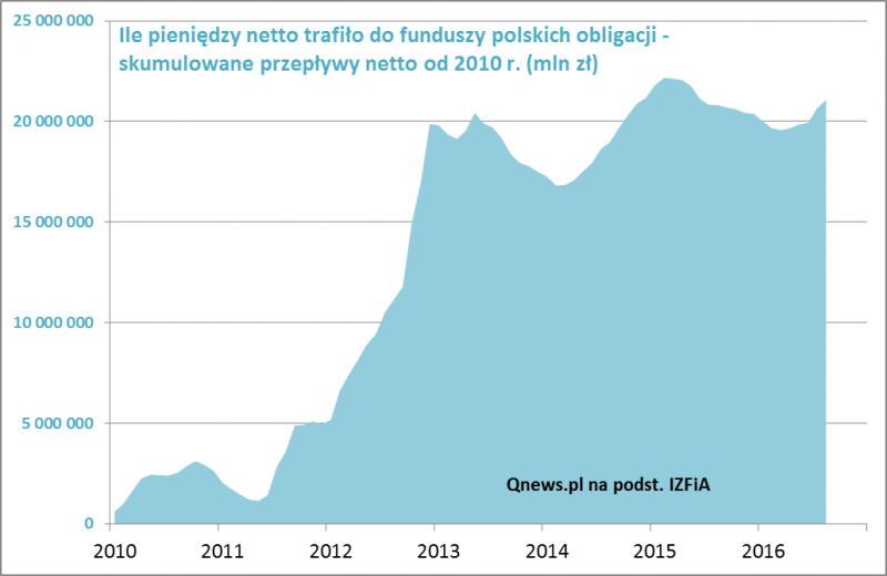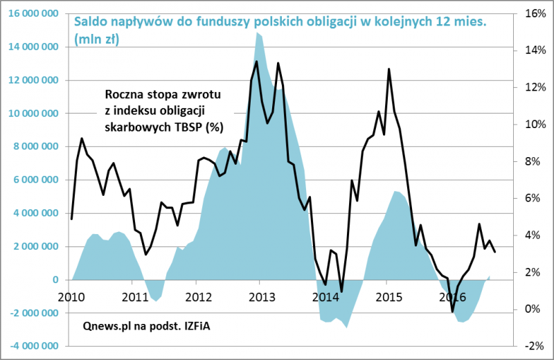 Wygląda na to, że napływy uzależnione są od bieżących stóp zwrotu, w szczególności tych za ostatnie 12 miesięcy. Kiedy stopy te poprawiają się, pojawia się świeża gotówka; kiedy się pogarszają, pieniądze uciekają. A ponieważ w ostatnich latach zyski z papierów skarbowych (zwłaszcza tych o stałym oprocentowaniu, których ceny wahają się wraz z oczekiwaniami dotyczącymi stóp procentowych) są bardzo cykliczne, to nieuchronnie największe napływy notujemy w momencie, gdy rynek obligacji ma za sobą bardzo udany okres.