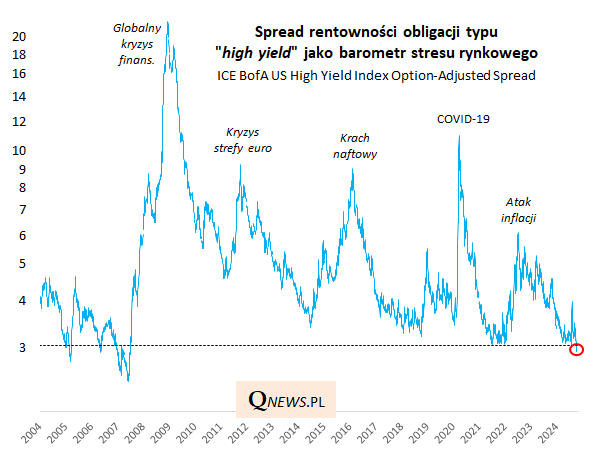 Apetyt na ryzyko na globalnych rynkach, bazujący na wierze w "miękkie lądowanie" gospodarek i pozytywny wpływ rozpoczętych obniżek stóp procentowych w USA, wkracza w nowy etap. Przekonać się o tym można, przyglądając się rynkowi obligacji "high yield", czyli obligacji korporacyjnych o podwyższonym ryzyku kredytowym, tzn. niemogących się pochwalić tzw. ratingiem inwestycyjnym (niekiedy określanych nieco złośliwie jako "śmieciowe"). W zamian za to wyższe ryzyko instrumenty te oferują pewną premię, wyrażaną standardowo jako tzw. spread - czyli nadwyżka rentowności - względem bezpiecznych obligacji skarbowych.