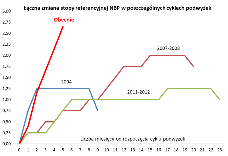 Dość znaczący jest fakt, że wspomniana rentowność benchmarkowych 10-latek ustabilizowała się w okolicy 4 proc. Właśnie ten pułap przewija się w prognozach ekonomistów jako poziom docelowy dla podwyżek stopy referencyjnej NBP. Czyżby zatem takie spodziewane zacieśnianie polityki monetarnej było już w pełni zdyskontowane przez rynek? Na kolejnym wykresie pokazujemy, że już teraz skala podwyżek przerasta każdy z poprzednich trzech cykli z ostatnich kilkunastu lat. Zakładamy, że przy takim szoku monetarnym spowolnienie wzrostu gospodarczego jest trudne do uniknięcia, co z kolei będzie powstrzymywało RPP przed jeszcze mocniejszymi podwyżkami.