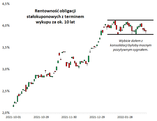 Po pierwsze rentowności zaczęły się stabilizować. Przykładowo pokazana na wykresie dochodowość benchmarkowych obligacji z terminem wykupu za 10 lat po okresie silnego, jednostajnego wzrostu, oscyluje od początku roku wokół pułapu 4 proc. Aż prosi się, by w przypadku tego wykresu posiłkować się prostą analizą techniczną. Wydaje się, że ewentualne wybicie dołem z formacji konsolidacji (trendu bocznego) stanowiłoby książkowy sygnał zapowiadający dalszy spadek rentowności, a więc jednocześnie zachętę do zakupów papierów stałokuponowych.
