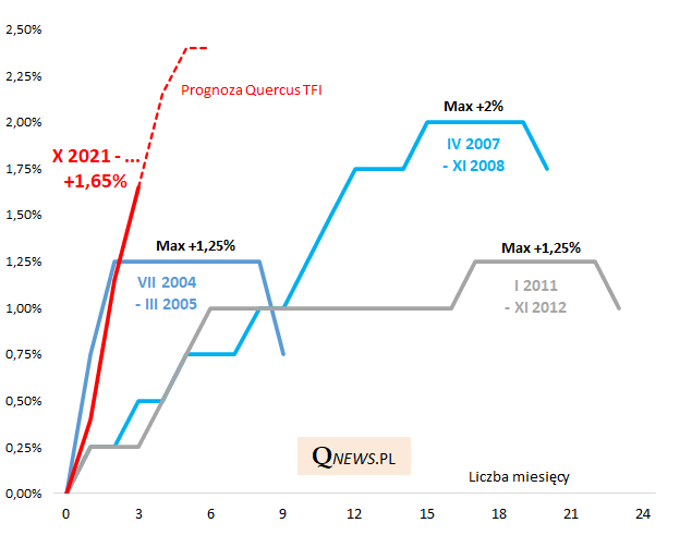 Jeśli sprawdzą się prognozy Quercus TFI zakładające jeszcze dwie podwyżki w styczniu i w lutym 2022 (odpowiednio o 0,5 i 0,25 pkt. proc.), w wyniku których stopa referencyjna osiągnęłaby docelowy pułap 2,5 proc., to już niebawem obecny cykl zacieśniania doczeka się miana nie tylko najgwałtowniejszego, ale również największego pod względem zasięgu w porównaniu ze wspomnianymi trzema poprzednimi seriami.