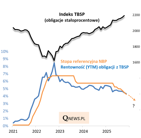 Na poniższym wykresie przypominamy, jak kluczowe znaczenie dla obligacji stałoprocentowych ma kierunek zmian poziomu stóp. Kiedy RPP agresywnie podnosiła stopy (jesień 2021 - połowa 2022), indeks TBSP przeżył bezprecedensową w swej historii bessę, bo wyższe stopy popchnęły w górę przyszłą rentowność obligacji, a wyższa rentowność to automatycznie niższe ceny instrumentów stałoprocentowych.