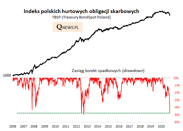 Jeszcze w marcu br. pisaliśmy o tym, że amerykańskie indeksy obligacji skarbowych poddały się jednej z najgłębszych korekt spadkowych w swej historii. W tamtym czasie korekta na polskim rynku "skarbówek" była natomiast jeszcze dość nieznacząca. Teraz widać, że w ostatecznym rozrachunku polskie papiery dłużne poszły jednak w końcu w ślady obligacji amerykańskich. Obecna korekta popularnego indeksu TBSP gromadzącego papiery hurtowe (stałokuponowe) jest już drugą najgłębszą w całej historii tego benchmarku (-4,8%). Już bardzo niewiele brakuje, by wyrównać rekordowe spadki odnotowane na przestrzeni 2012 roku, które osiągnęły próg -5%.