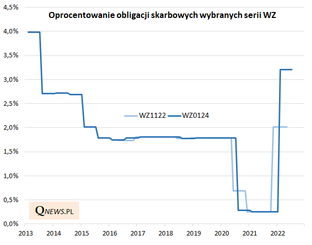 Kolejny etap odbywającej się od jesieni 2021 "rewolucji" na rynku długu. Oprocentowanie kolejnych dwóch serii obligacji skarbowych typu WZ (o zmiennym kuponie) podskoczyło w rozpoczynającym się właśnie kolejnym okresie odsetkowym (kończącym się w lipcu) z 0,25% do 3,21%. To poziom najwyższy od ... prawie dziewięciu lat (!). Już wcześniej, w listopadzie oprocentowanie pozostałych papierów WZ podskoczyło do 2,02%.