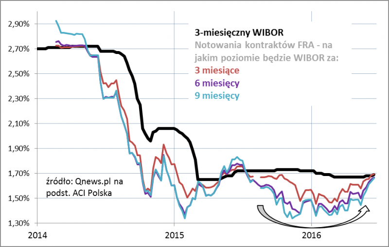 Wykres pokazuje, że od jesieni ub.r. do wiosny br. notowania kontraktów FRA  były wyraźnie poniżej bieżącego poziomu stawki WIBOR. To oznaczało, że uczestnicy rynku spodziewali się spadku stóp procentowych (mniej więcej o 0,25 pkt. proc.). W ostatnich trzech miesiącach rynek stopniowo wycofał się z tych oczekiwań. Obecnie notowania FRA są już praktycznie na poziomie bieżącego WIBOR-u, co oznacza, że zdaniem instytucji finansowych będących stronami kontraktów FRA najbardziej prawdopodobnym scenariuszem jest brak zmian stóp procentowych. Bez wątpienia wpłynęły na to wypowiedzi nowego prezesa NBP A. Glapińskiego, który opowiedział się przeciwko agresywnemu łagodzeniu polityki pieniężnej. Nie bez znaczenia jest też wzrost cen ropy naftowej oraz ostatnie osłabienie złotego (działające inflacyjnie).