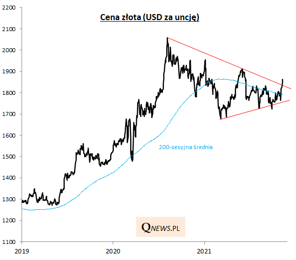 Ciekawy rozwój wydarzeń na rynku złota. Widoczna jest tu próba zakończenia długotrwałej korekty spadkowej rozpoczętej jeszcze od sierpnia 2020. W języku analityków technicznych mamy do czynienia z wybiciem w górę z formacji przypominającej "trójkąt".
