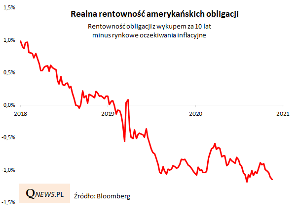 Efekt jest taki, że realna (skorygowana o oczekiwania inflacyjne) rentowność obligacji nie tylko nie rośnie, lecz wręcz przeciwnie - jest nieopodal minimów.