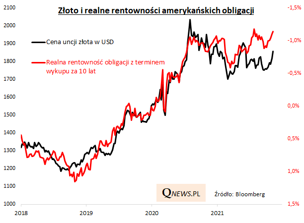Jak można to tłumaczyć w sferze fundamentalnej? Odwołajmy się do opisywanych wielokrotnie zależności, wg których o cenach złota decydują dwa elementy: (a) rentowności amerykańskich obligacji traktowanych często jako podstawowa konkurencja dla złota, (b) rynkowe oczekiwania inflacyjne. Spośród tych dwóch elementów uwagę zwracają obecnie zwłaszcza oczekiwania inflacyjne, które wspięły się właśnie na nowy szczyt (inwestorzy oczekują inflacji na poziomie 2,7% w skali roku w horyzoncie 10-letnim). Nominalna rentowność obligacji 10-letnich wyraźnie nie nadąża za tymi oczekiwaniami. Czyżby przyczyną była uporczywie "gołębia" retoryka Rezerwy Federalnej, która od miesięcy określa wysoką inflację jako "przejściową"?