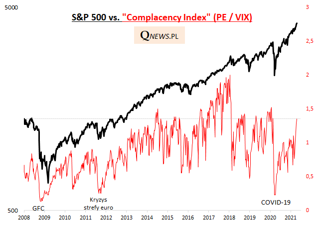 Reasumując, Complacency Index będący próbą połączenia P/E (wyceny) i VIX (zmienność) w jedną całość, przed rokiem trafnie wskazywał niebywałą okazję inwestycyjną. Obecnie jest raczej na wysokim poziomie (brak okazji), ale nie wykluczalibyśmy, że może znaleźć się jeszcze wyżej.
