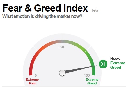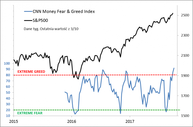 Tym razem garść krótkoterminowych rozważań. Nasza diagnoza z II połowy sierpnia okazała się trafna. Wskazywaliśmy wtedy, że amerykański S&P 500 po przebyciu zgodnej z "planem" korekty miał duże szanse, by powrócić do trendu wzrostowego. Tak też się stało. Jednym z argumentów było zejście jednego z naszych ulubionych krótkoterminowych wskaźników nastrojów - CNN Money Fear & Greed Index - do strefy "skrajnego strachu". Od tego czasu sytuacja odwróciła się jednak o 180 stopni. W ostatnich dniach wskaźnik nie tylko zawędrował dla odmiany do strefy "skrajnej chciwości", ale na dodatek znalazł się najwyżej w swej kilkuletniej historii (CNN publikuje go od trzech lat).
