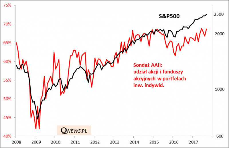 A skoro już o wskaźnikach nastrojów mowa, to warto też przytoczyć rezultaty najnowszego, wrześniowego sondażu Amerykańskiego Stowarzyszenia Inwestorów Indywidualnych. Z deklaracji członków AAII wynika, że udział akcji/funduszy akcji w ich portfelach urósł do 68,7 proc. To odczyt w okolicach maksimów z ostatnich czterech lat. Wypada wspomnieć, że w dołku bessy na początku 2009 roku z sondażu wynikało, że inwestorzy indywidualni mieli tylko 42 proc. akcji w portfelach.