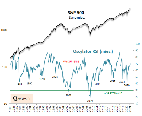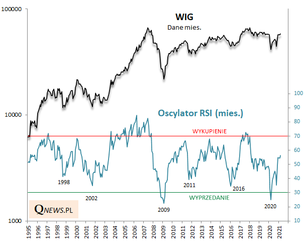 Przełom miesiąca to zawsze okazja, by zaktualizować rozmaite wskaźniki. Tym razem przyjrzymy się popularnemu oscylatorowi RSI (w ujęciu miesięcznym), którego zadaniem jest sygnalizowanie kiedy rynek jest "wyprzedany", a kiedy "wykupiony".