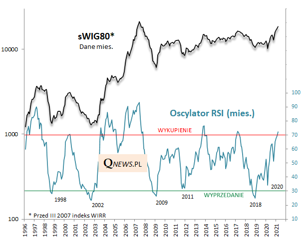 Co ciekawe stan wykupienia osiągnął natomiast najmocniejszy ostatnio segment polskiego rynku - akcje małych spółek. W tym przypadku miesięczny RSI przekroczył już granicę 70 pkt. - po raz pierwszy od ... czterech lat. Niepokoić może fakt, że przy porównywalnych poziomach RSI kończyły się fale hossy w latach 2017 i 2000. Ale z drugiej strony w trakcie najbardziej pamiętnych epizodów RSI potrafił dojść nawet do ponad 90 pkt. (!), więc nie ma żadnej gwarancji że "hossa maluchów" zaraz dobiegnie końca.