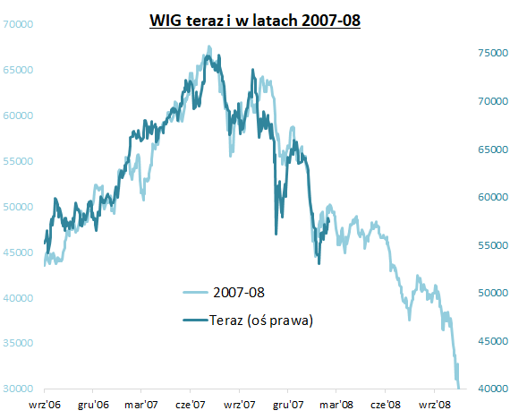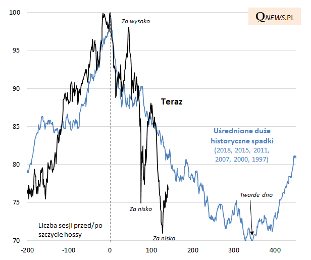 W naszych porównaniach nie poprzestajemy jednak na tym, co prawda najbardziej podobnym jak na razie, ale też pod innymi względami odmiennym (dużo niższe wyceny akcji) historycznym przypadku. Być może bardziej uzasadnione wydaje się porównywanie obecnej sytuacji ze średnią trajektorią WIG-u z różnych dużych historycznych spadków (nie tylko z 2008 roku) - również taka metoda pozwalała w ostatnich miesiącach na trafne diagnozy.