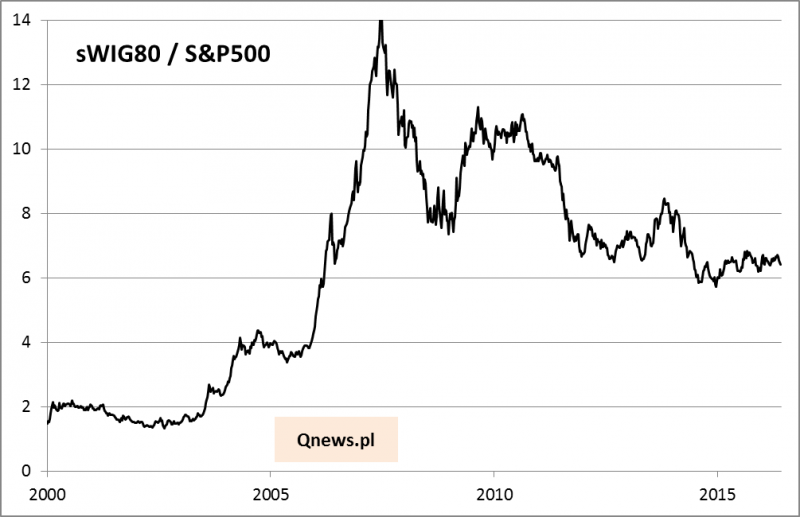 Pocieszać się można, że sytuacja wygląda dużo lepiej w przypadku małych spółek. Indeks sWIG80 zachowuje się neutralnie względem S&P500. Tutaj dno supercyklu z grudnia 2014 r. nie zostało pogłębione.